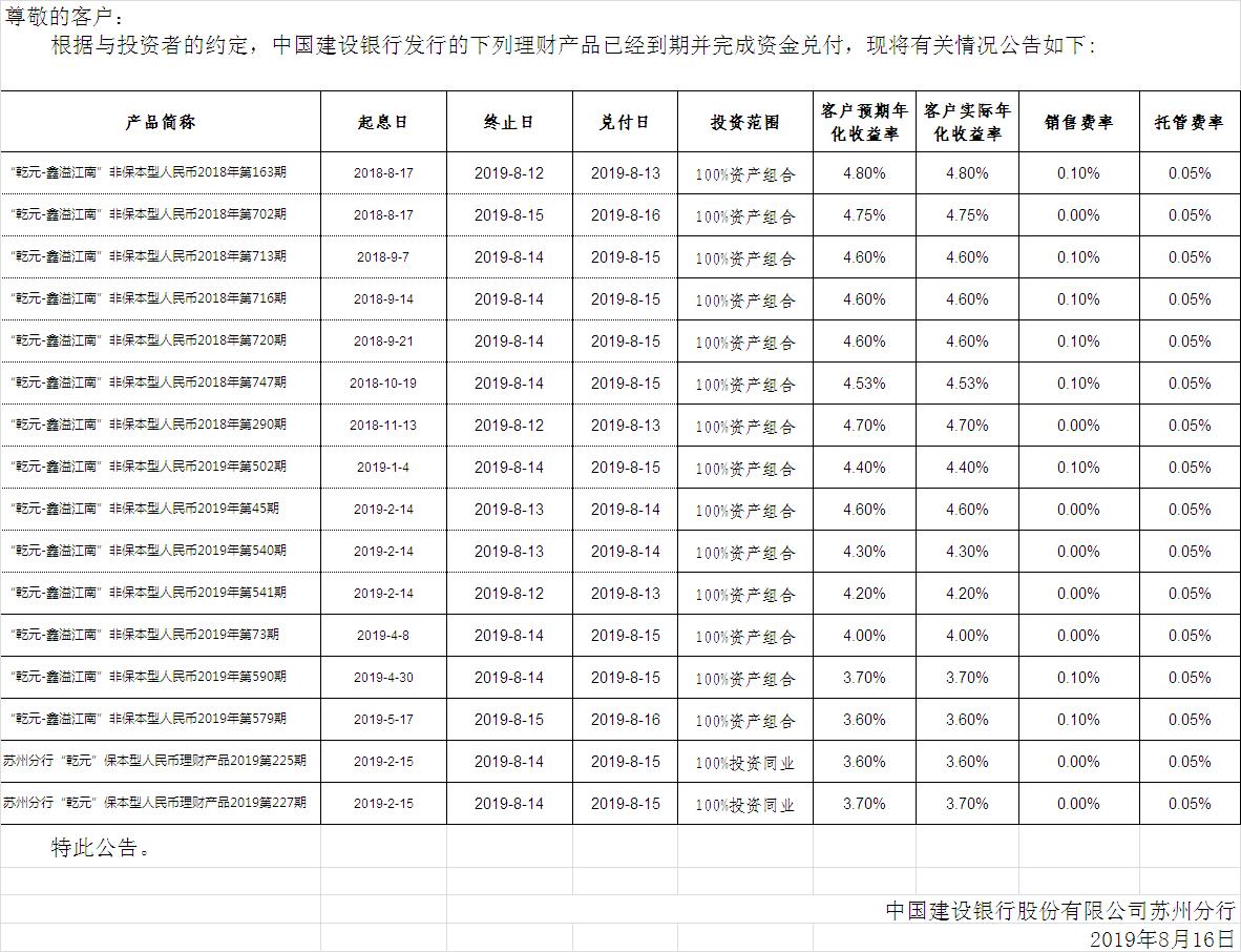 中国建设银行理财产品终止及清算公告